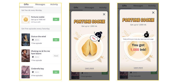 Tapas Fortune Cookie is a weekly campaign to test your fortune by getting a random amount of Bonus Ink. The event occurs every Monday, in sync, to your local timezone.