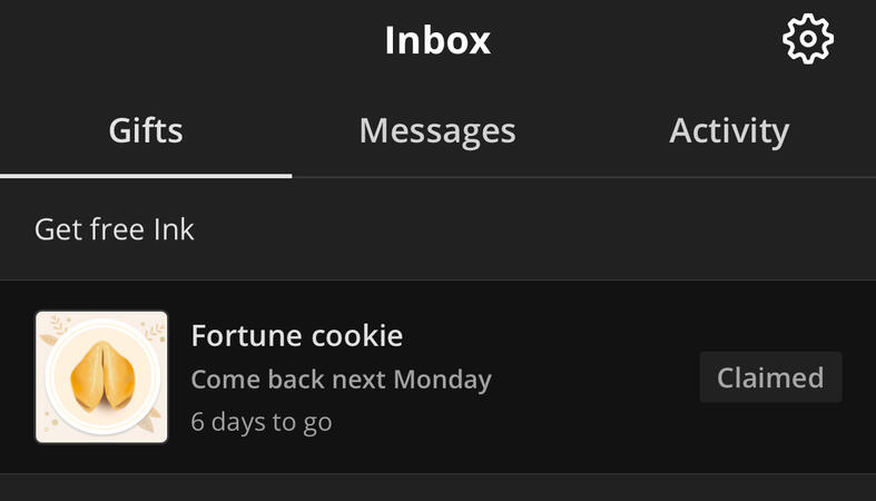 Visit the 'Gifts' tab (located inside 'Inbox' on the app) on Mondays to claim your Ink. Simply tap the fortune cookie to crack it open. Your Ink prize will automatically be added to your account. Fortune Cookie will only be available on Mondays so make sure to not miss the window or you'll have to wait until the following week to get a new fortune cookie.