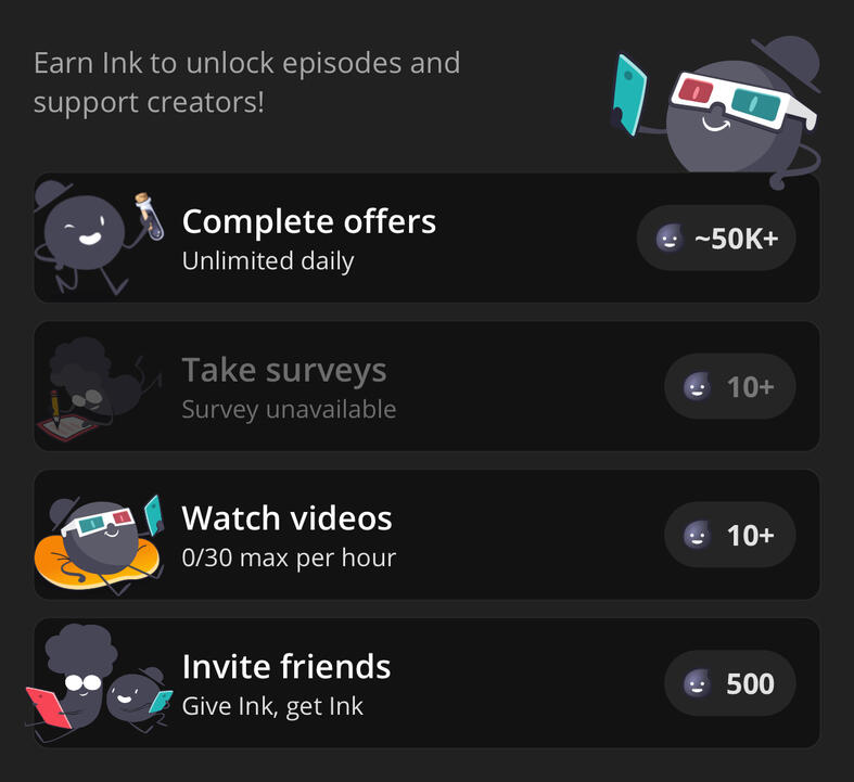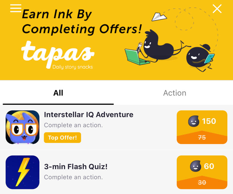 You can Earn 10 inks each time you finished this offer. Available surveys can vary per user. Survey offers are available on both the Tapas app and website, though they’re limited on the website.