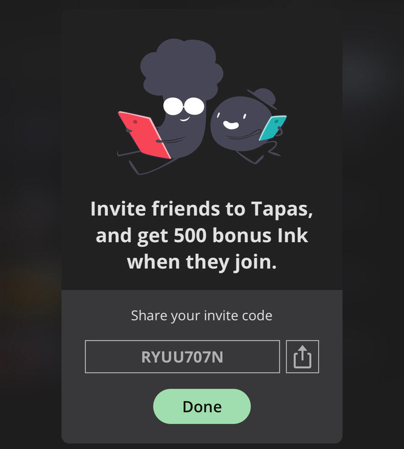 If you've never had a Tapas account, you can use someone else's Invite Code to get some bonus Ink when you sign up in the Android or iOS app.